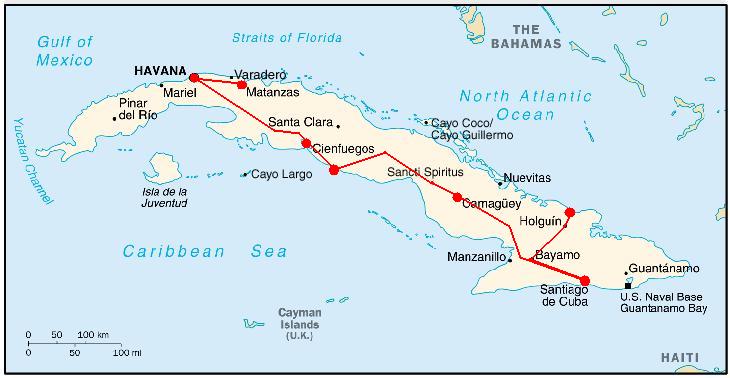 2003, Mit dem Mietauto (Suzuki Grand Vitera) ca. 1'400 Km quer durch die Insel Kuba. Vom wilden Osten in dem zivilisierten Westen. Primär muss man sich an den spärlichen Touristen-Tankstellen entlang orientieren. Ausser Santiago de Cuba sind Camagüey (Centro), Trinidad (Festival & AI-Hotel) und Cienfuegos (Centro) sehr interessante uns schöne Orte. Las Tunas und Sancti Spiritus sind eher einfache und scheinbar ärmliche Städte...